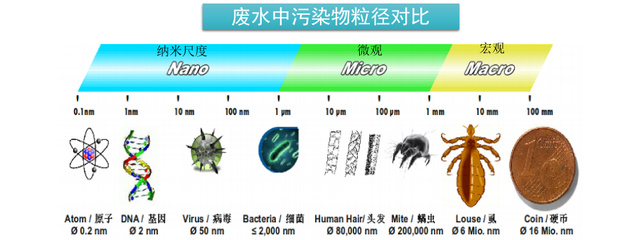 MBR膜式由不同孔徑的高分子材料組成的一種特殊的化學制品,分別為微濾膜、超濾膜、納濾膜和反滲透膜幾種,下圖就是MBR膜不同孔徑下可以阻隔或截留的各種物質的類型: